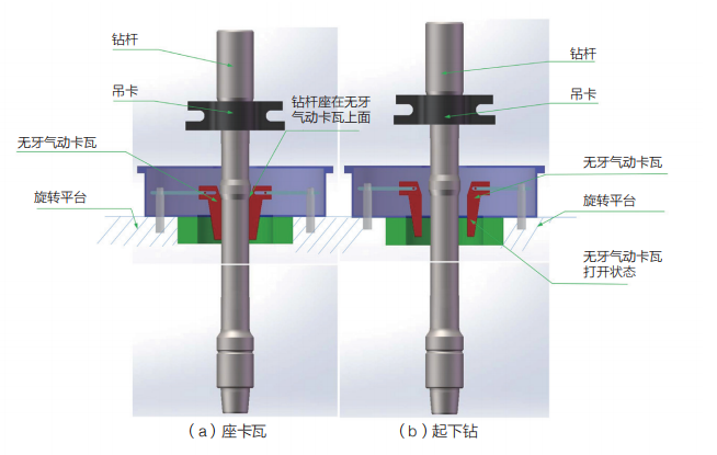 海隆零卡瓦咬傷快速起下鉆鉆桿,是專(zhuān)門(mén)為解決起下鉆作業(yè)時(shí)卡瓦牙咬傷鉆桿本體及雙吊卡作業(yè)效率低,勞動(dòng)強(qiáng)度大等問(wèn)題而設(shè)計(jì)開(kāi)發(fā)的一種特殊產(chǎn)品。其特點(diǎn)是在 API 普通鉆桿的基礎(chǔ)上,距內(nèi)螺紋接頭端面一定位置處增加一個(gè)抬肩。在起下鉆時(shí),鉆柱坐在氣動(dòng)卡瓦上,重力由氣動(dòng)卡瓦的承載滑塊軸向承載,管體表面無(wú)卡瓦咬痕,可有效降低管端刺穿風(fēng)險(xiǎn)。另外,內(nèi)螺紋接頭上卸扣位置提高,方便上卸扣。